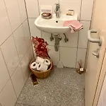 Das Apartment Ruhiges Messezimmer im Diplomatenviertel mit Grünblick verfügt über ein Badezimmer mit einem Haartrockner und Badelaken. Außerdem gibt es hier eine getrennte Toilette und eine Dusche.